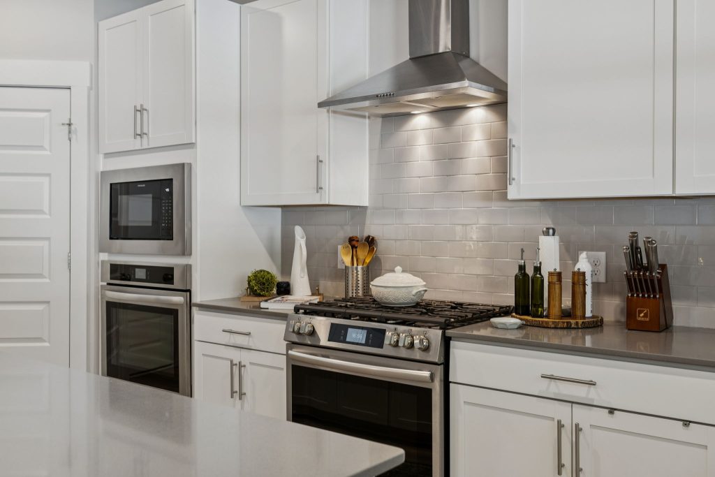 The gourmet kitchen features quartz countertops, a gas stove, an oversized island, and a walk-in pantry, all flowing seamlessly into a bright living area with a cozy fireplace. The main level includes a guest bedroom with a full bath and a spacious primary suite with dual closets and an oversized walk-in shower.